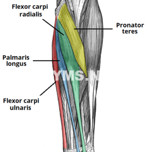 The anterior superficial layer contains four muscles that originate from the medial epicondyle. The pronator teres muscle attaches to the shaft of the radius and is the most medial of the muscles in this layer. Its primary action is the pronation of the forearm. The flexor carpi radialis contributes to abduction and attaches to the base of metacarpals II and III.